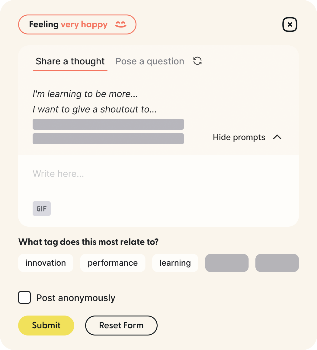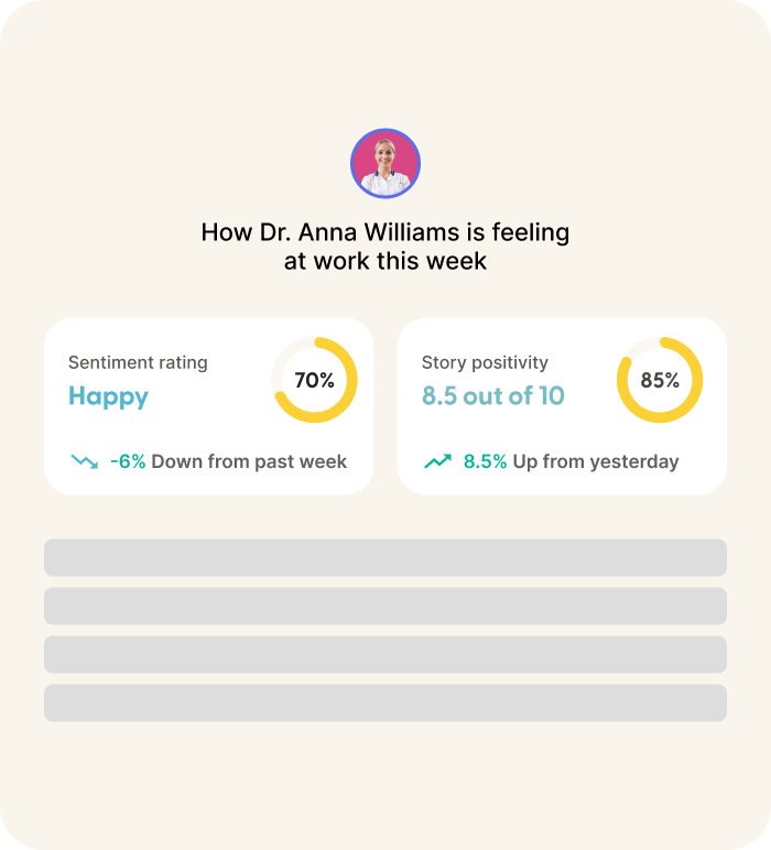 Team members check-in at their weekly meeting, when prompted by notifications when they have something to share. Their story is analyzed for sentiment, put through a moderation filter, auto-categorized, and then posted (with the option of anonymity).